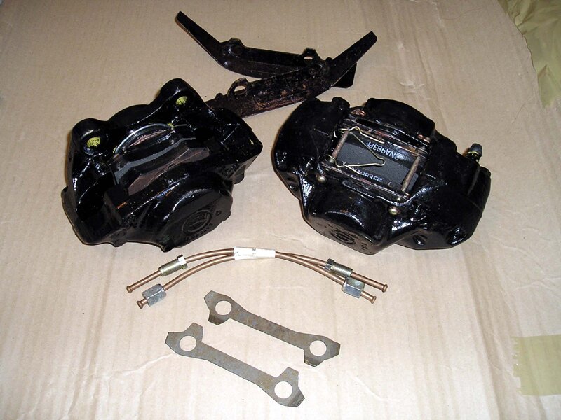 These were found on EBay, described as Mk2 Escort callipers. However they are identical to the Cortina ones. I.e. they are M16 callipers. The auction had only been running a couple of hours when I stumbled across them, and luckily they had a Buy It Now option. 2 brand new recon callipers, a set of standard pads, fitting kit, solid pipes, and some splash sheilds. I dont require the pads, so will probably sell those to get some money back. How much for the pair? Well a bargain at £35 for the set! Painted black as well (saves me some time) to match my 'colour' (should that be lack of colour?) scheme.